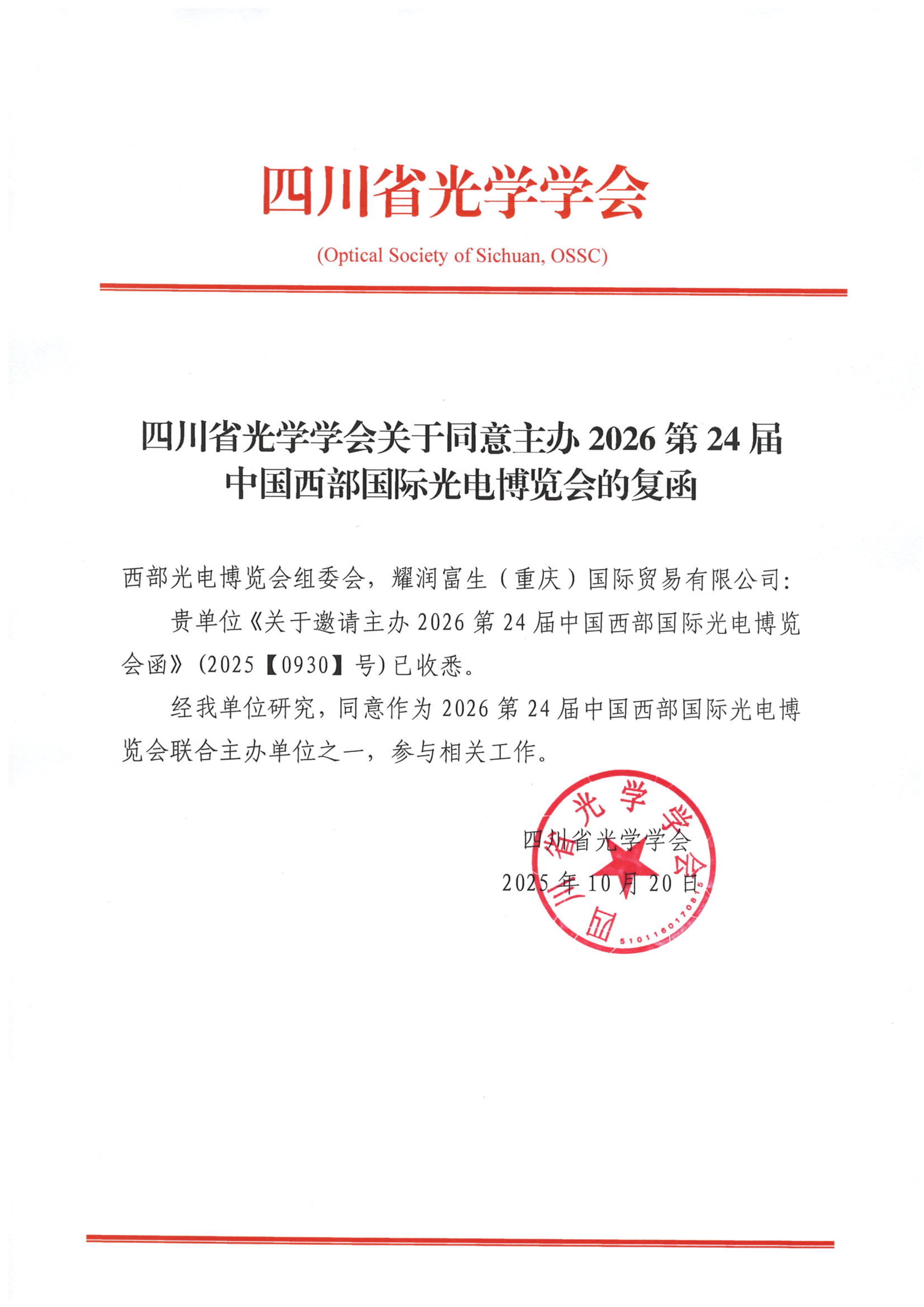 贵单位《关于邀请主办2026第24届中国西部国际光电博览会函》(2025【0930】号)已收悉。经我单位研究,同意作为2026第24届中国西部国际光电博览会联合主办单位之一,参与相关工作。
